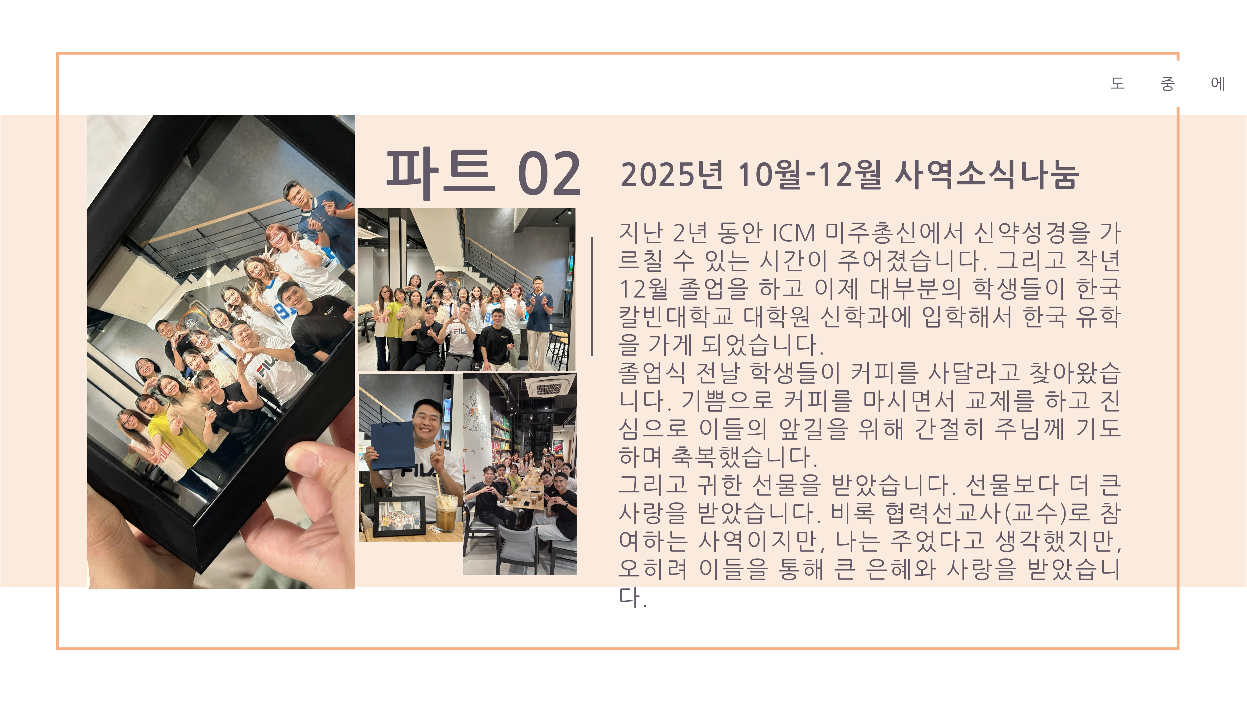 그동안 기도로, 물질로, 봉사로, 재능으로 헌신해 준 분들께 감사드리고, 모든 영광 하나님께 드립니다